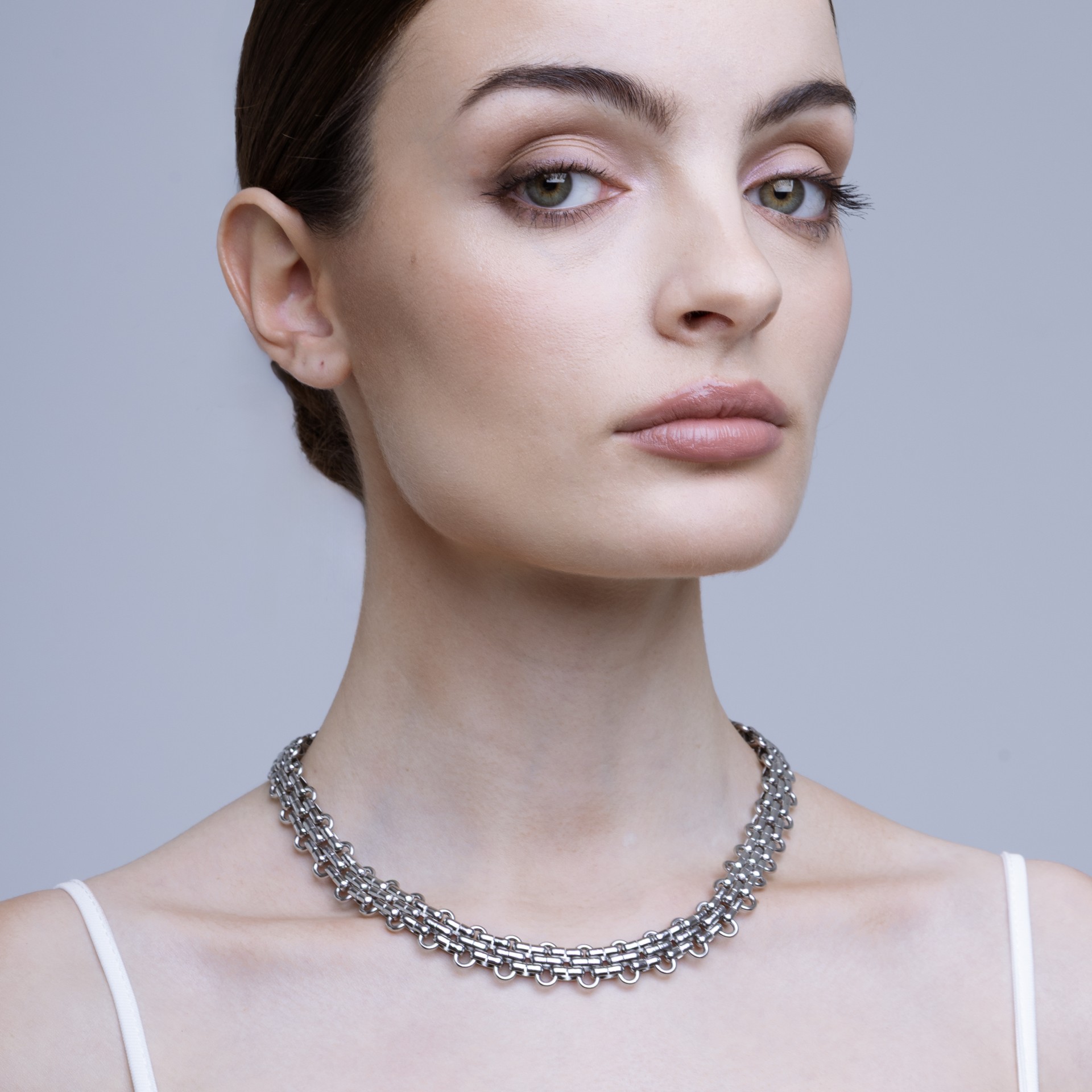 Η ασημί του λάμψη χαρίζει πολυτέλεια χωρίς υπερβολή, ενώ η σταθερή εφαρμογή του προσφέρει άνεση και αυτοπεποίθηση σε κάθε κίνηση. Ένα κολιέ που δεν ακολουθεί τις τάσεις — τις δημιουργεί.