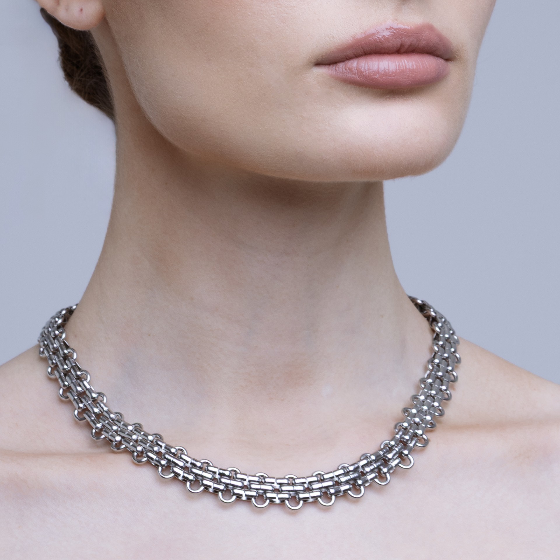 Ένα εντυπωσιακό Unixex ασημί κολιέ με πολυεπίπεδες αλυσίδες μπορεί να φορεθεί από γυκαίκα και άνδρα ενώ αποπνέει δυναμισμό και σύγχρονη κομψότητα. Ο layered σχεδιασμός του δημιουργεί ένταση και κίνηση στον λαιμό, μετατρέποντας ακόμη και το πιο απλό outfit σε statement εμφάνιση.