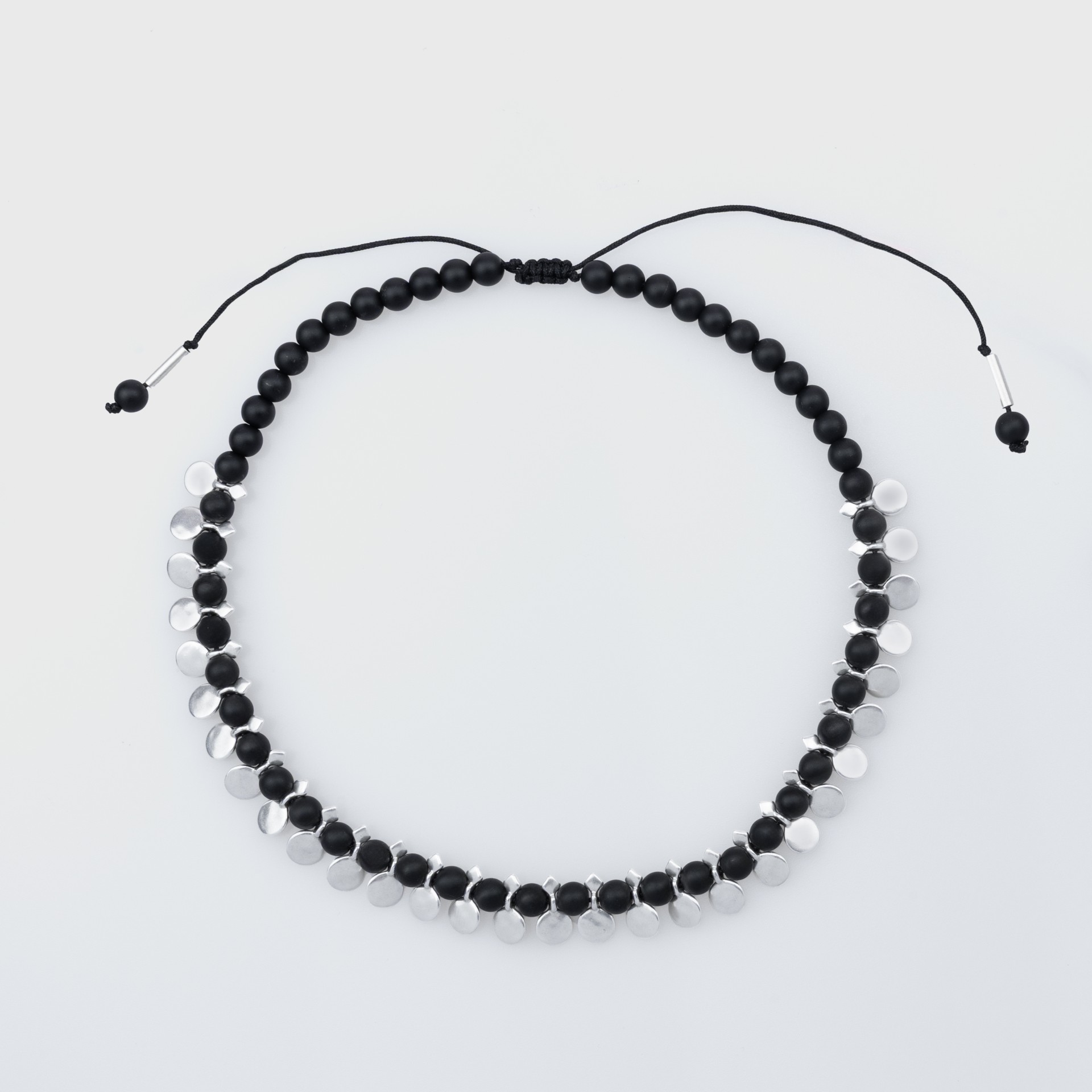 Μαύρο κολιέ με ματ χάντρες και ασημί λεπτομέρειες που συνδυάζει μυστήριο και κομψότητα. Η έντονη αντίθεση μαύρου και ασημί δημιουργεί ένα μοντέρνο, δυναμικό αποτέλεσμα που αναβαθμίζει άμεσα κάθε σύνολο.